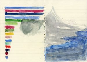 A faire ce jour n’est pas une injonction, pas même le protocole d’un devoir quotidien. Le carnet d’aquarelles dont est extrait ce feuillet évoque plutôt la vitalité, l’action, la mobilité, la légèreté. Dessiner se fait à toute heure, dès que l’occasion se présente : sur un coin de table, dans un train, ce jour, ou le jour d’après. Il s’agit, pour l’artiste, de s’éveiller à l’observation, à l’invention, à la réflexion. Suchan Kinoshita renoue, ici, avec la pratique d’Hokusai Katsushika, grand maître de l’estampe qu’elle admire et qui, en 1814, invente un mot pour désigner ses innombrables carnets de croquis : la manga, néologisme issu de deux idéogrammes, man et ga. On traduira par dessins (man) foisonnants, légers, dérisoires, grotesques, spontanés, exécutés sans but préconçu (ga). De double culture, à la fois nipponne et européenne, et plus particulièrement allemande, Suchan Kinoshita (1960) inscrit sa pratique tant dans les sphères de la création sonore et des arts performatifs que des arts plastiques. Elle vit et travaille à Bruxelles. Elle est lauréate de l’édition 2025 du Belgian Art Prize.